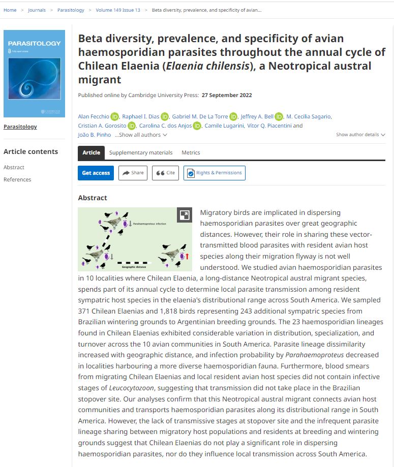 Betadiversity, prevalence, and specificity of avian haemosporidian parasites throughout the annual cycle of Chilean Elaenia (Elaenia chilensis), a Neotropical austral migrant